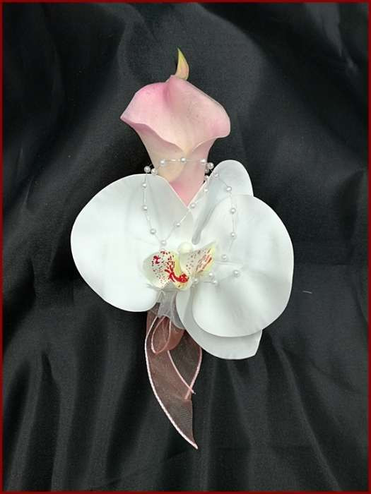 Rózsaszín kála-fehér orchideás, barack-fehér díszítésű kitűző, bokréta