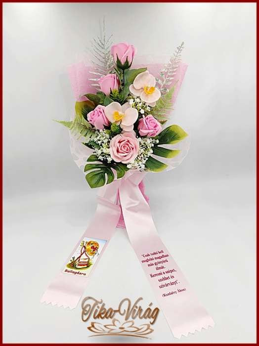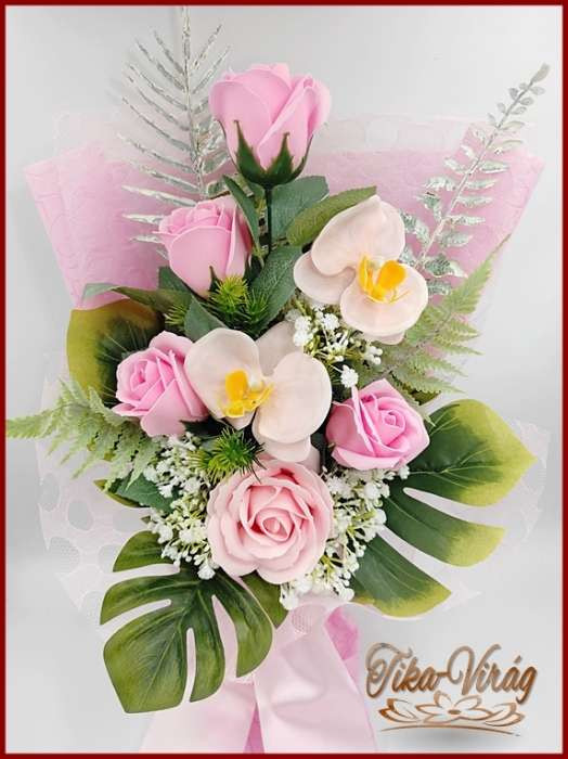 Rózsaszín rózsák- rózsaszín orchideás szappan-virág csokor + ballagó szalaggal 134555.