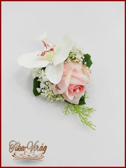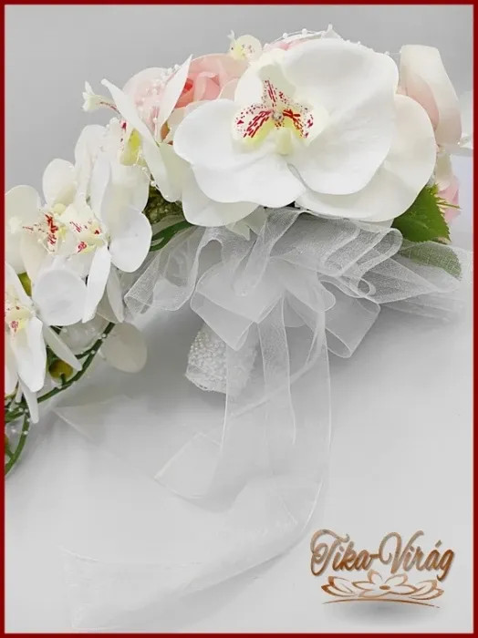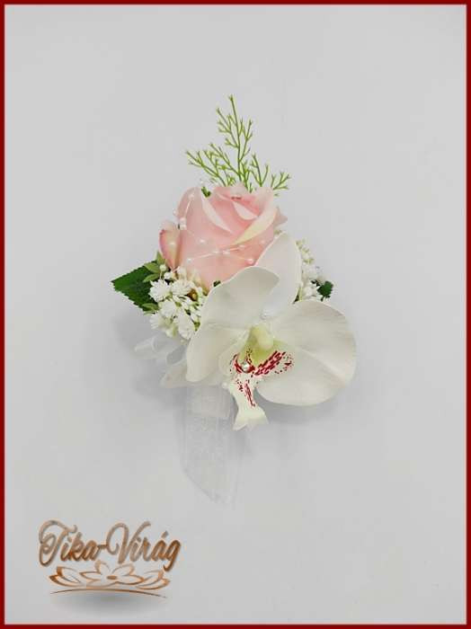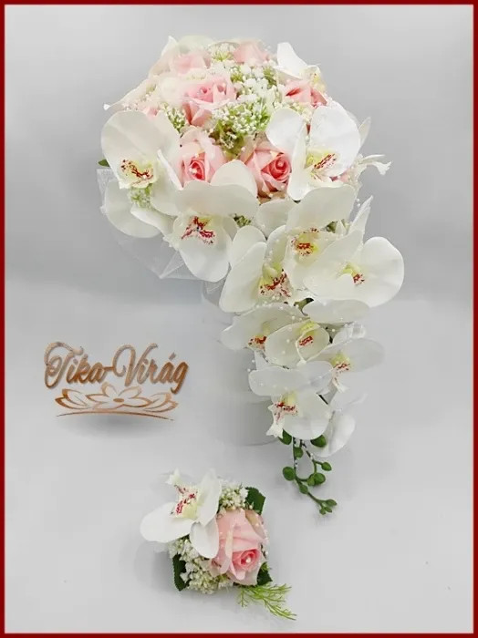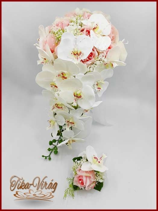 Rózsaszín rózsás- Fehér orchideás örök-csepp csokor + kitűzővel 100856.