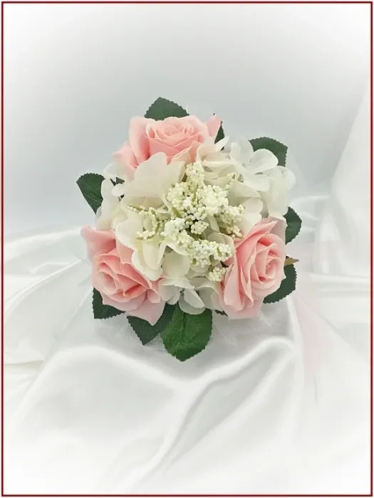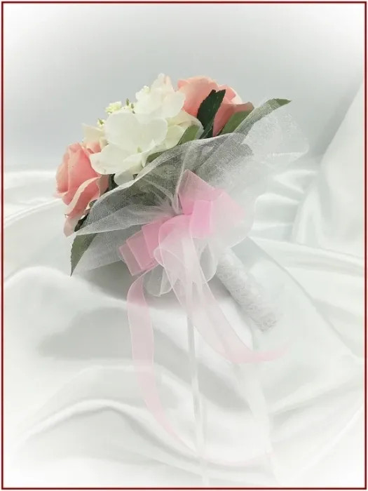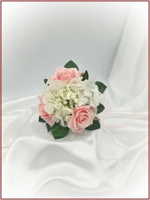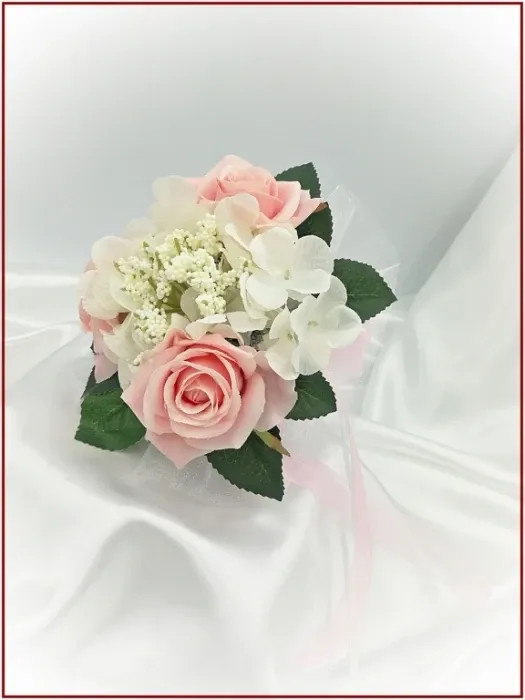 Rózsaszín rózsás-fehér díszítésű örök-csokor 162817. Mérete: 18cmx17cm Más színben is kérhető! Ajánlom: dobó, köszöntő, koszorúslány örök-csokornak.