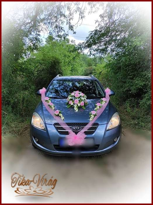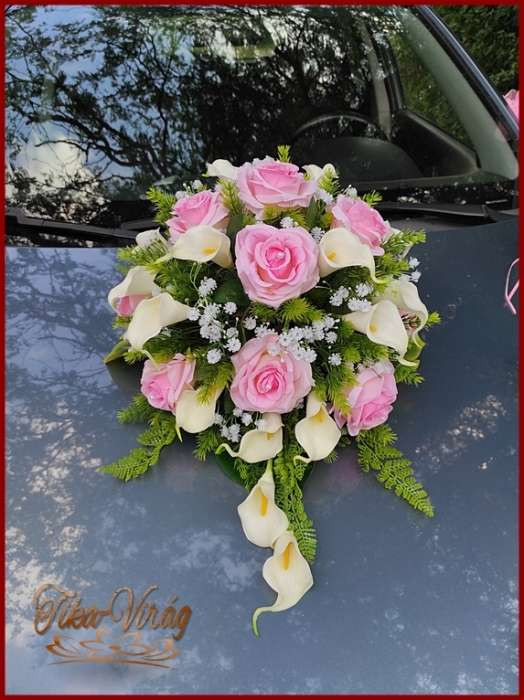 Rózsaszín rózsás-fehér kálás autódísz- rózsaszín organza díszítéssel 112821.