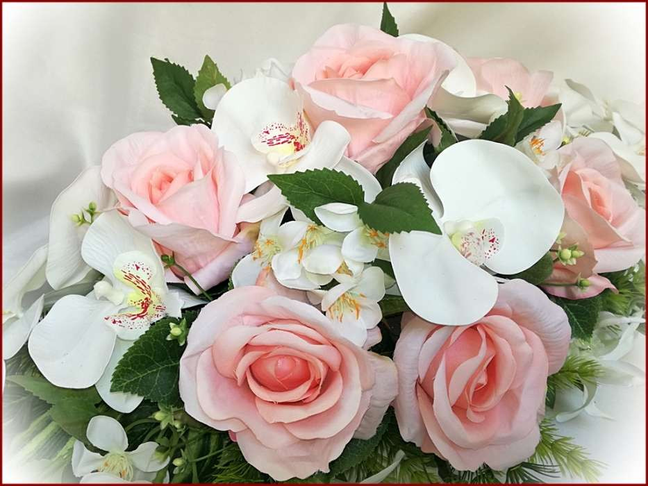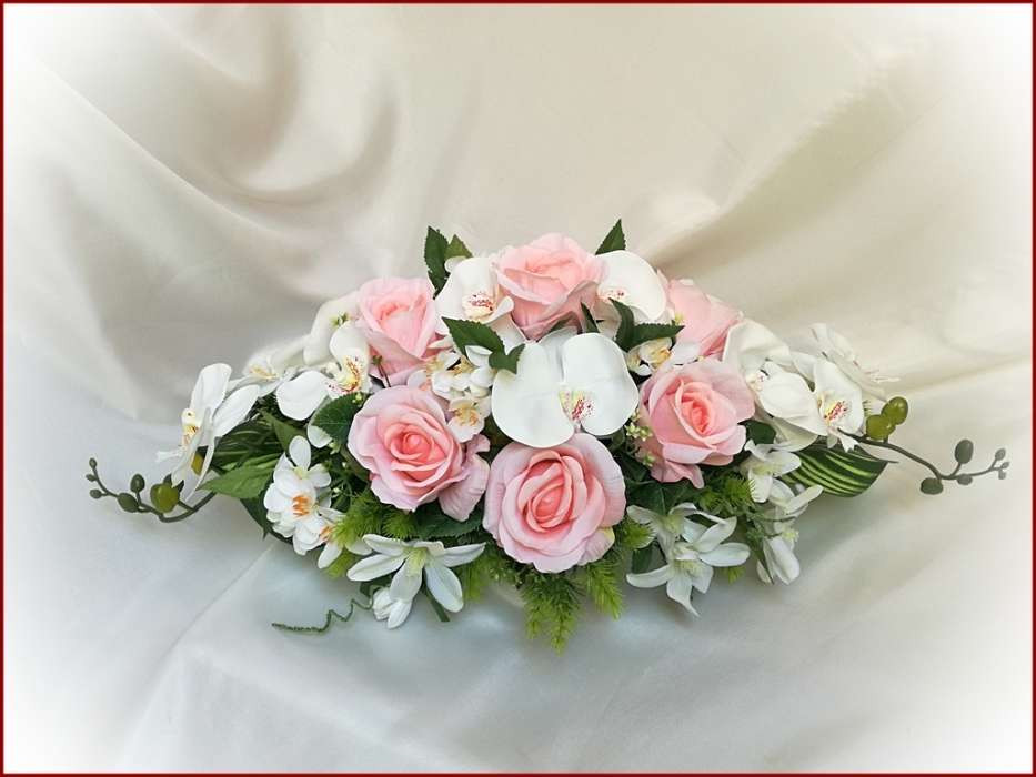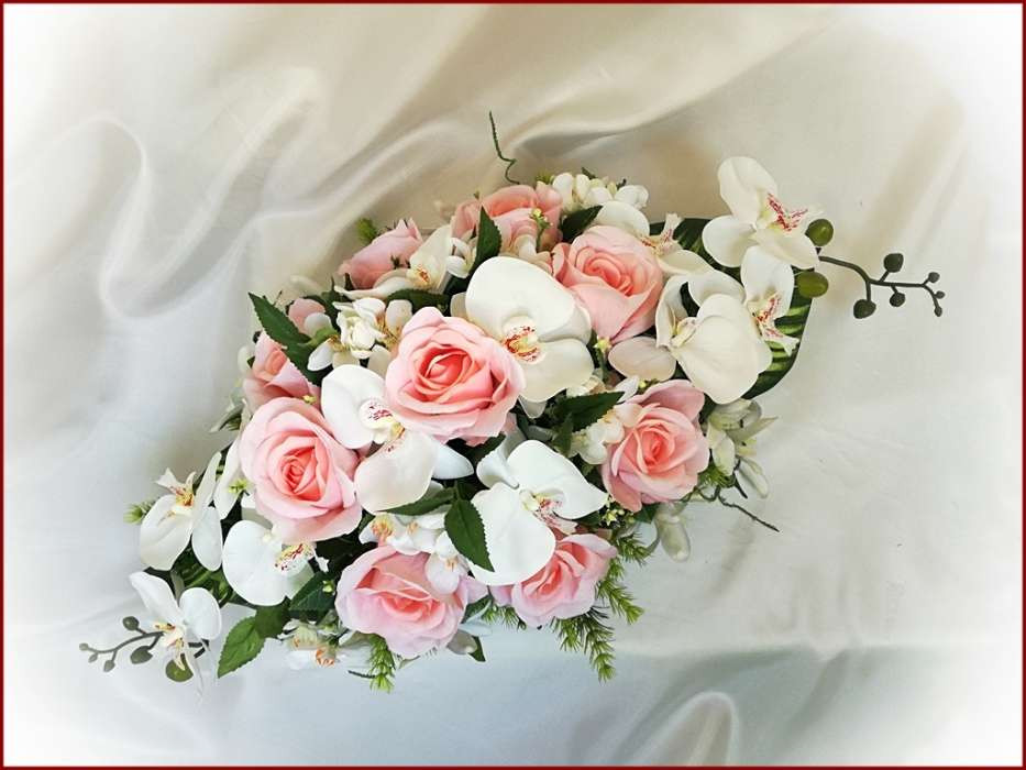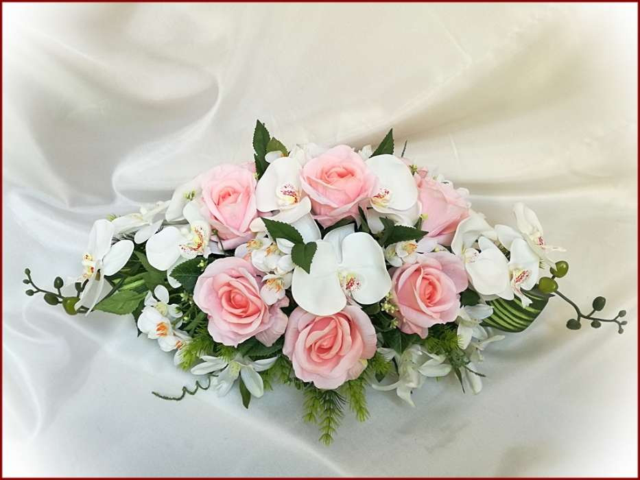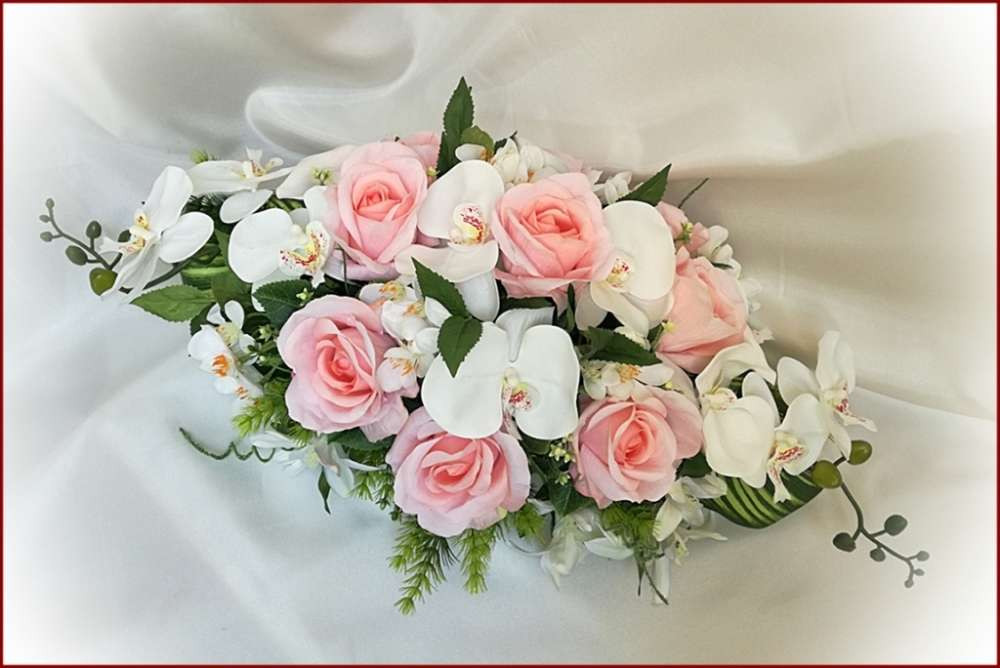 Rózsaszín-rózsás fehér-orchideás örök-asztaldísz 120719. 9 szál rózsából, fehér-orchideás és iszalaggal díszítve. Asztaldísz méretei: hossza: 55cm szélessége: 30cm magassága: 20cm Más színben is kérhető!