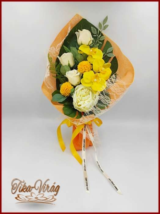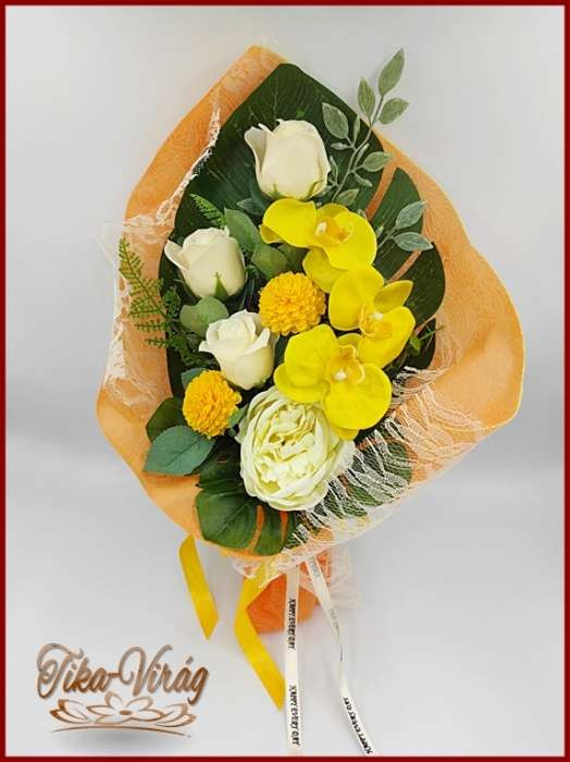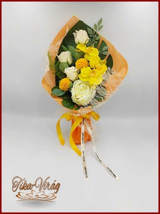 Sárga orchideák, dália - ekrü rózsák és peónia szappan-virág csokor 171841.