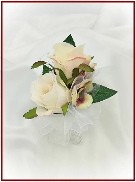 Sötét-mályvás-pasztell 2 virágos kitűző, bokréta