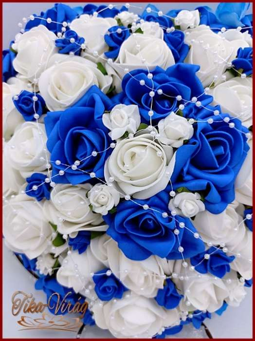 Királykék-fehér rózsából álló, különleges indás díszítésű autódísz. Más színben és színdíszítésben is kérhető!