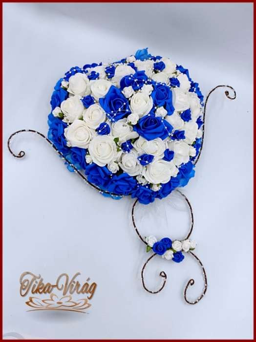 Szív-alakú, különleges formájú autódísz királykék-fehér rózsákból 120504.