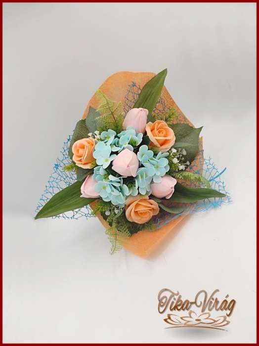 Egy különleges vegyes csokor szappan rózsa, tulipán és hortenzia virágokból. Igen intenzív illatú! Nem hervad, tartós.