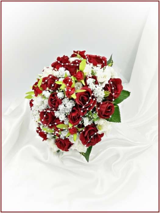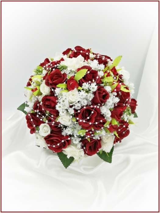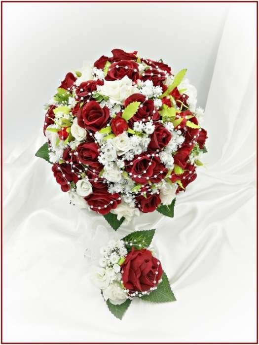 Vörös-rózsa örök-csokor fehér díszítéssel + kitűzővel 121838.