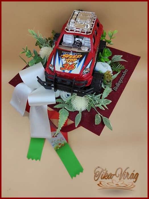 Ovis ballagási örök csokor fiúknak, terepjárós díszítéssel.