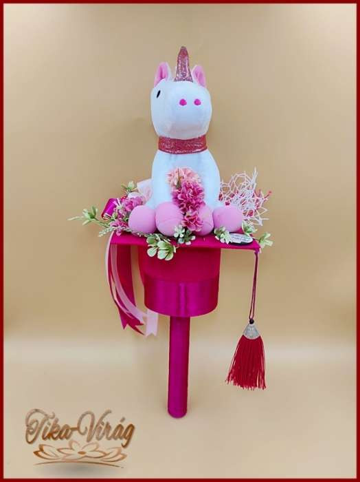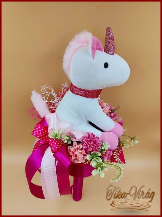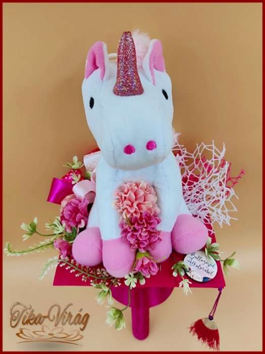 Ez a bájos csokor nemcsak virágokból áll, hanem egy puha, plüss unikornissal is díszített, hogy még különlegesebb legyen az ünnep. A színpompás virágok és a varázslatos unikornis kombinációja minden kislány álmait valóra váltja, és emlékezetessé teszi a ballagást.