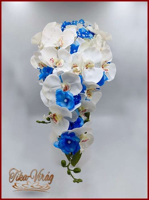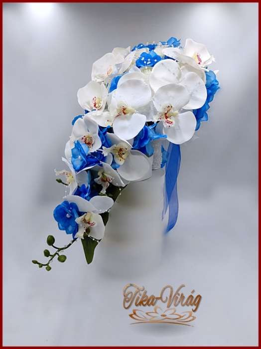 24 szálas Fehér rózsás- Fehér orchideás király-kék hortenziával díszített örök-csepp csokor 115919.