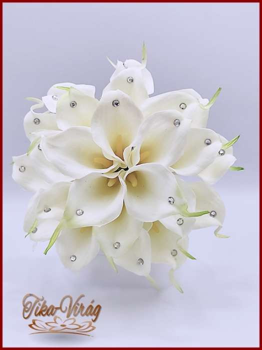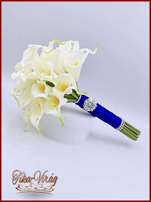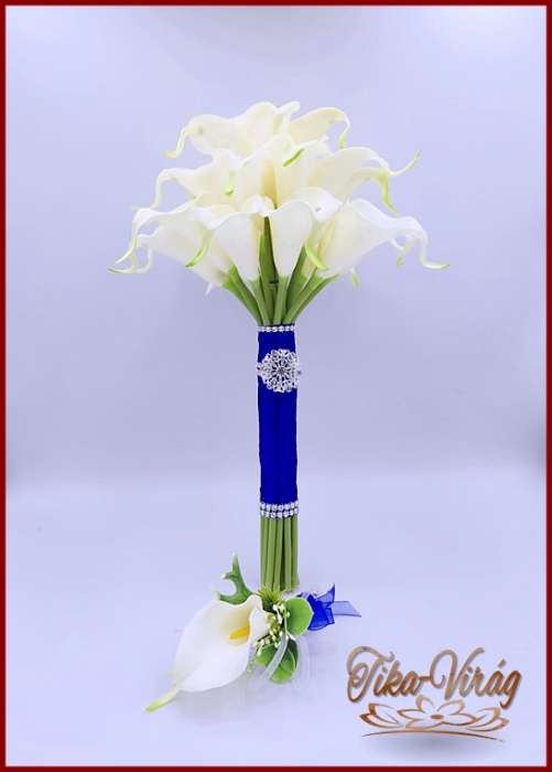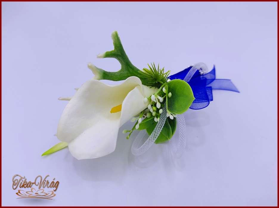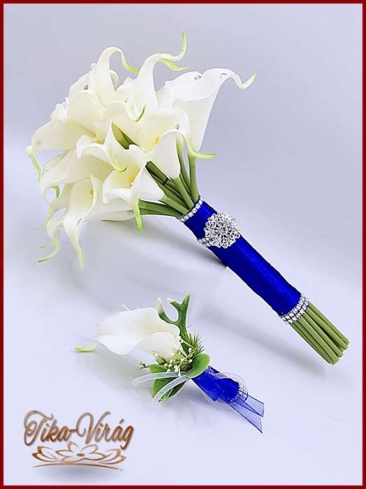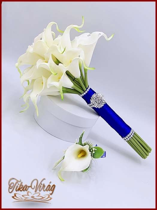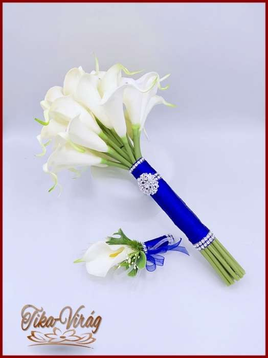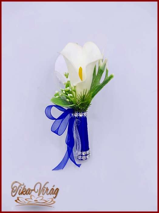 24 virágos Fehér Kála örök-csokor királykék díszítéssel + kitűzővel 121006.