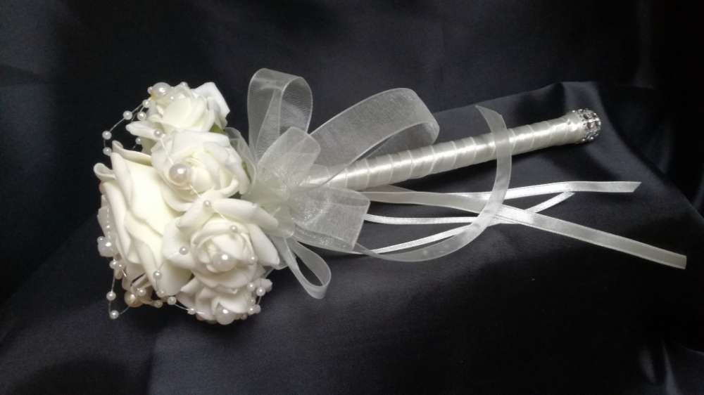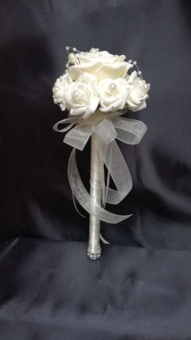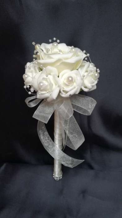 Ekrü dobó, koszorúslány vagy köszöntő örök-csokor 123138. Csokor hossza: 25cm átmérője: 12cm fej magassága: 8cm Más szín-összeállításban is kérhető!