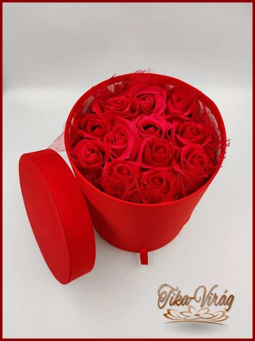 Szín: Piros henger alakú doboz, 12 szál illatos piros szappanrózsával.