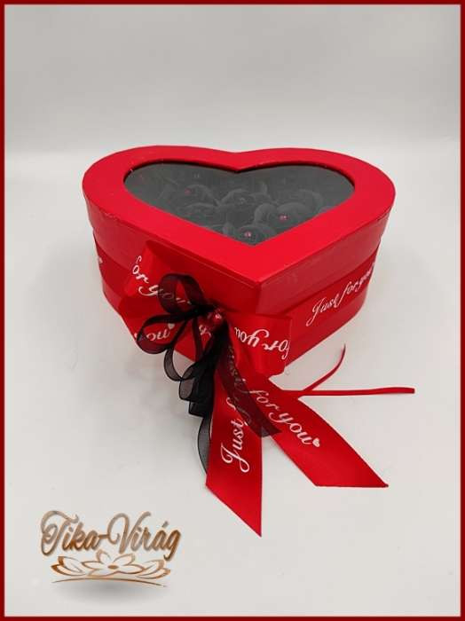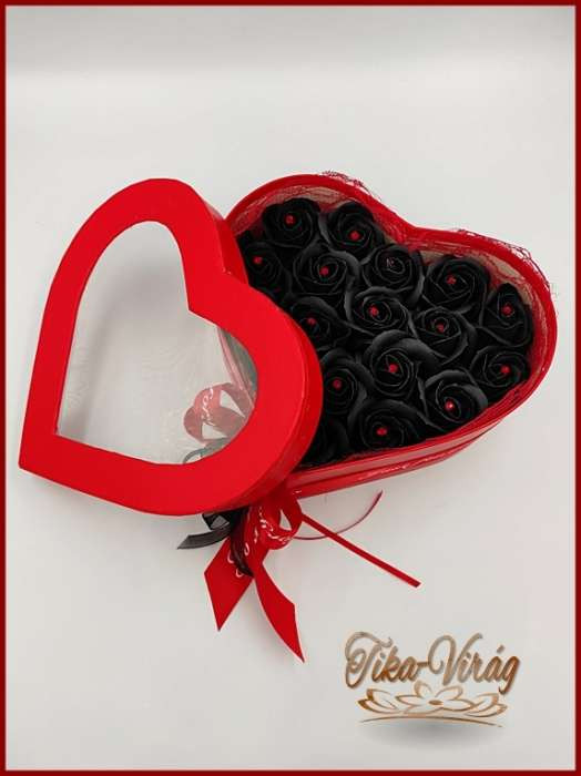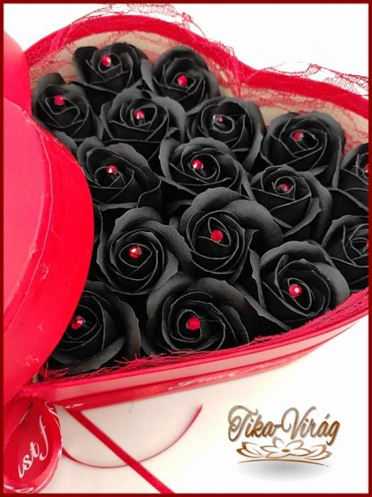 Szín: Piros szív doboz, 18 szál fekete szappanrózsával. A fekete szappanrózsák piros kövekkel vannak díszítve.