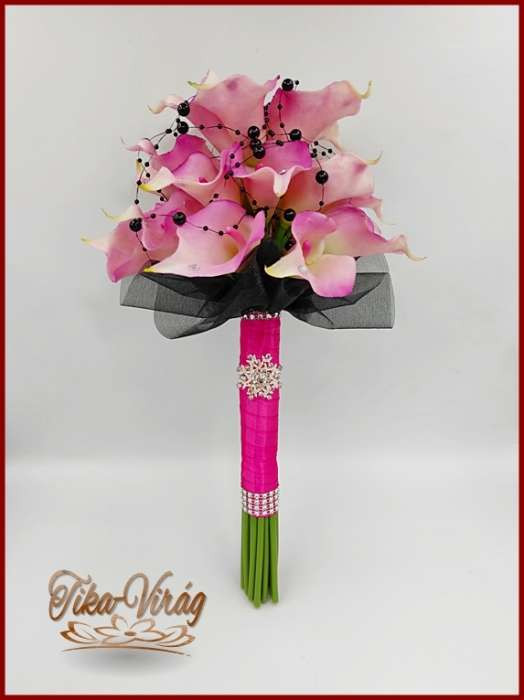 24 virágos Lila Kála örök-csokor fekete-pink díszítéssel 161127. Magassága: 35cm Szélessége: 22cm Hozzá illő kitűző, bokréta is rendelhető! Más színben és szín-díszítésben is kérhető!