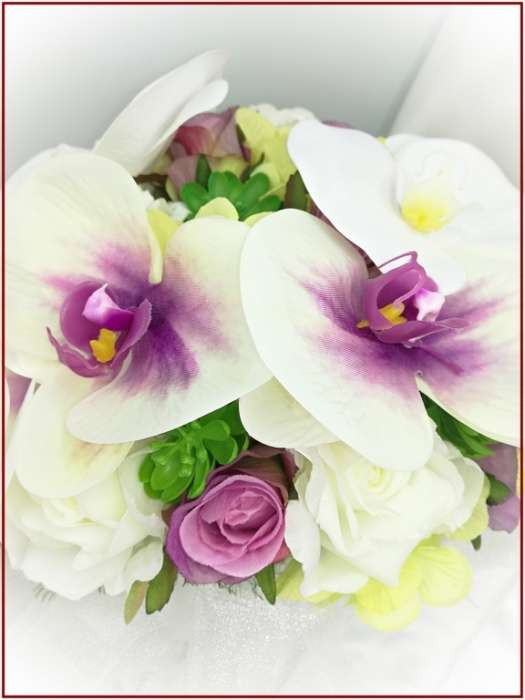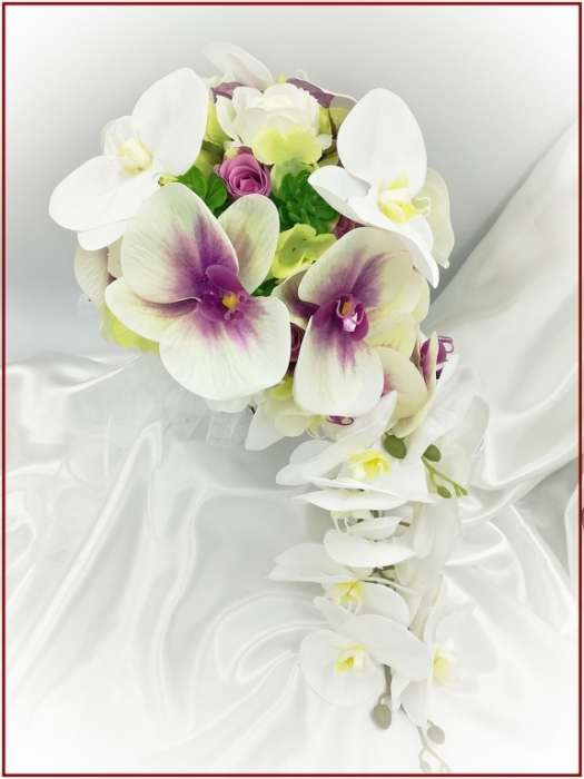 Lila-Fehér Orchideás-Rózsás, zöld Hortenziás Örök-cseppcsokor 164408. Csokor mérete: 48cm hosszú 24cm széles 26cm magas Más színben és szín-díszítésben is kérhető!