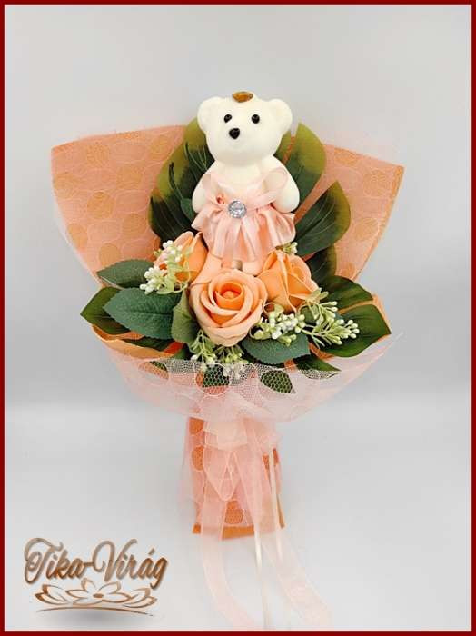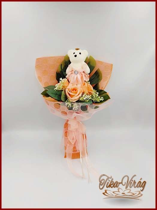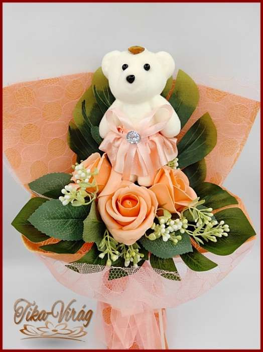Barack maci 3 szál szappan-rózsával 174422. Mérete: 35x20cm Ajánlom Nőnapra, de szép ajándék lehet ballagásra, születésnapra, névnapra, vagy bármely köszöntésre.