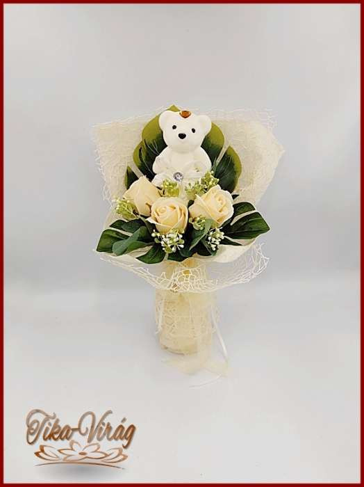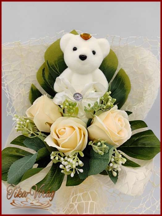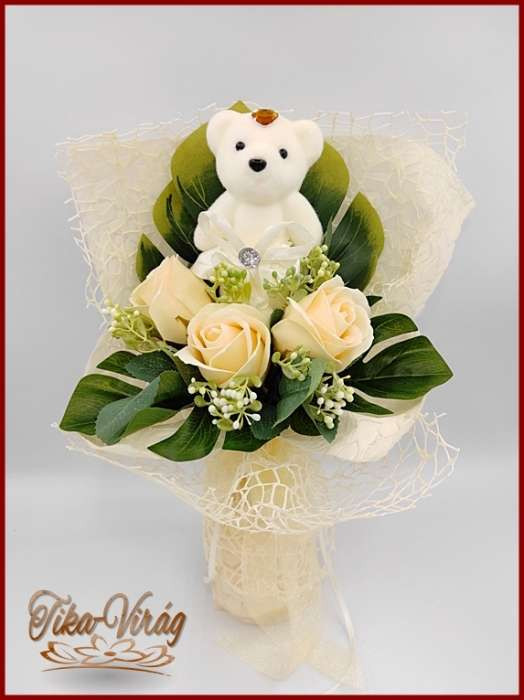 Ekrü maci 3 szál szappan-rózsával 174602. Mérete: 35x20cm Ajánlom Nőnapra, de szép ajándék lehet ballagásra, születésnapra, névnapra, vagy bármely köszöntésre.