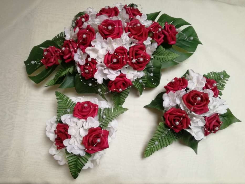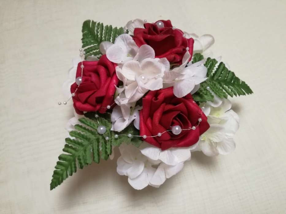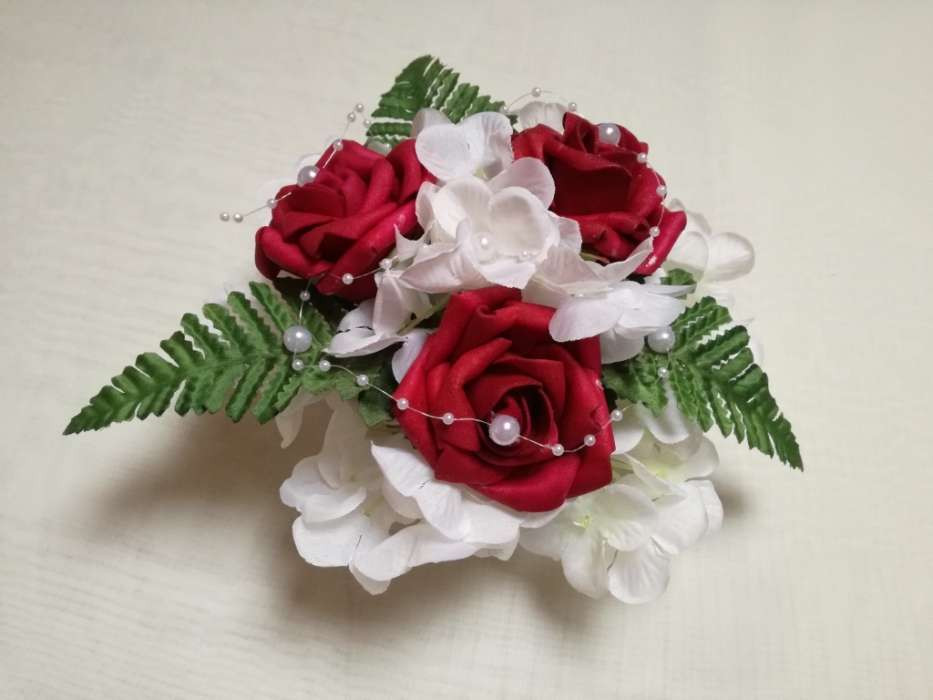 Bordó rózsás-fehér hortenziás örök-asztaldísz 180914. Asztaldísz méretei: hossza: 18 cm szélessége: 20 cm magassága: 10 cm Más színben, szín-díszítéssel is kérhető!