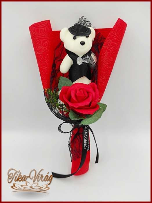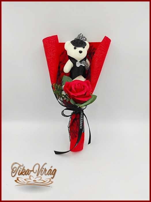 Piros szappan rózsa-fekete macival 183043. Mérete: 25x15cm Ajánlom Nőnapra, de szép ajándék lehet ballagásra, születésnapra, névnapra, vagy bármely köszöntésre.