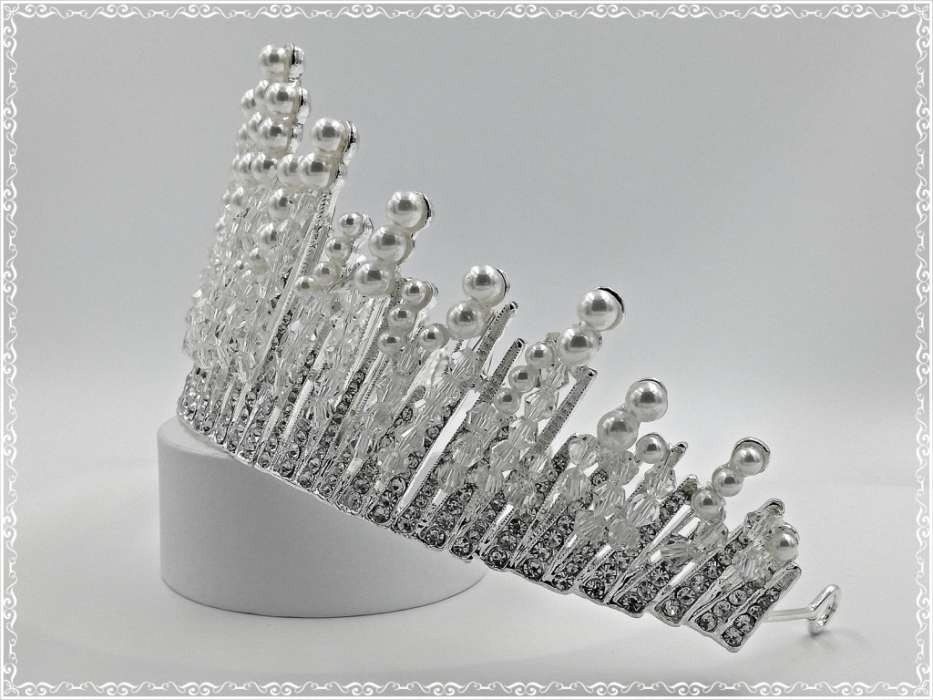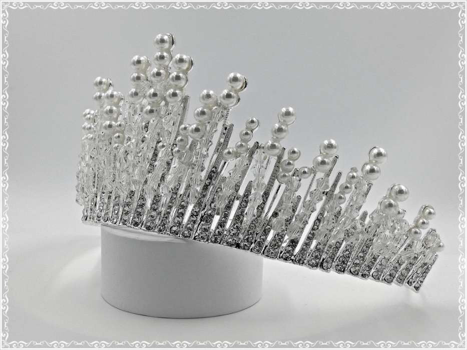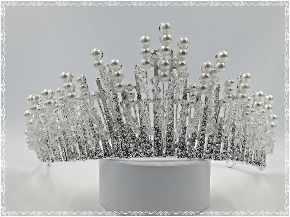 Korona C4591-170801. Mérete: -magassága: 7cm -díszítés hossza: 26cm Tekla- és kristály-gyönggyel díszített strasszos Korona.