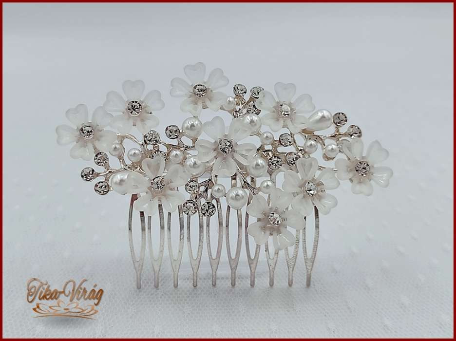 VIRÁGOKKAL DÍSZÍTETT STRASSZOS FEHÉR KONTYTŰ 10 CM X 6 CM CARCI-22604.