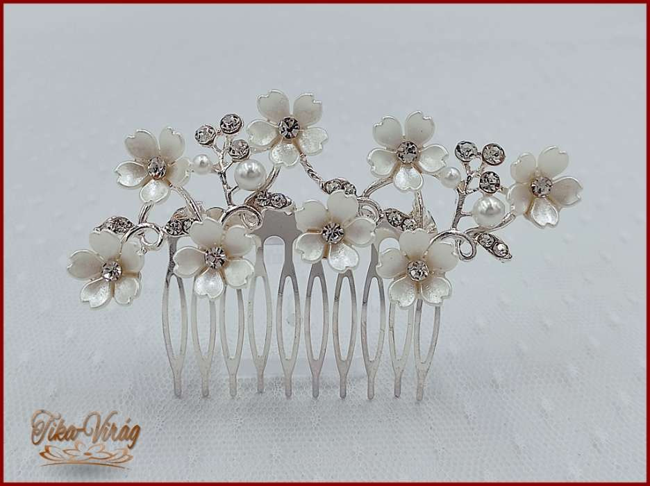 VIRÁGOKKAL DÍSZÍTETT STRASSZOS FEHÉR KONTYTŰ 10 CM X 4 CM CARCI-22606.