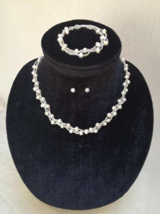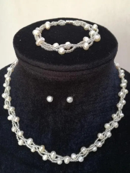 Ekrü gyöngyös ékszer nyaklánc, karkötő és fülbevalóval együtt.