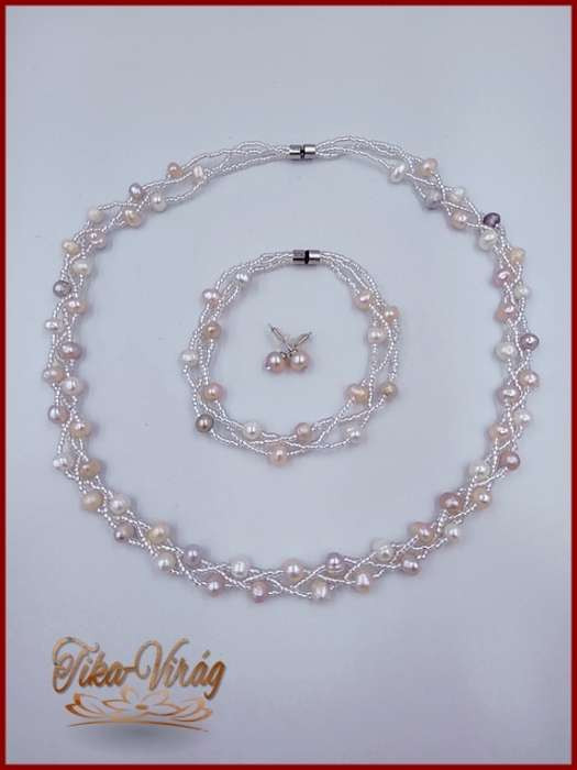 TENYÉSZTETT-GYÖNGY NYAKLÁNC SZETT BÉZS-BARACK-MÁLYVA