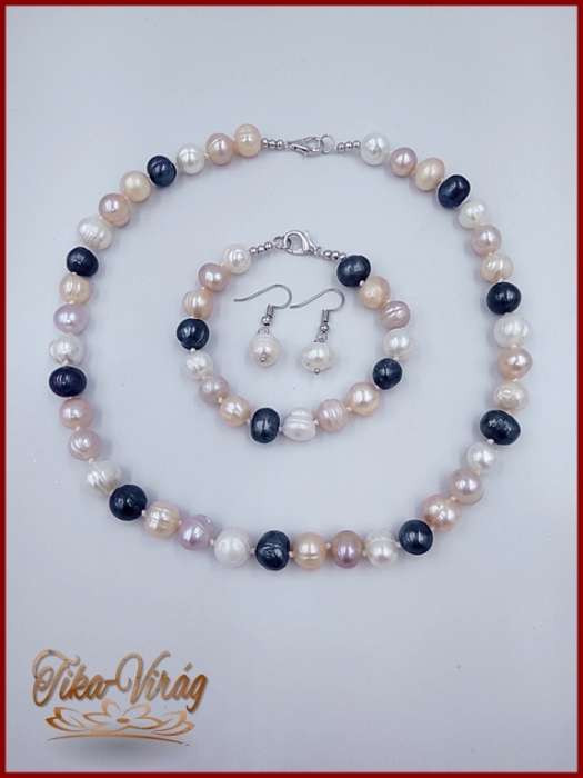 TENYÉSZTETT-GYÖNGY NYAKLÁNC SZETT KÉK-BÉZS SZÍNŰ